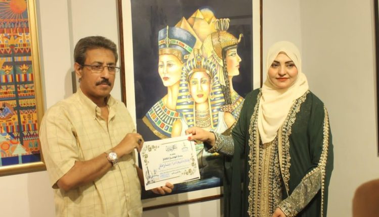 في مقر (أكاديمية أَتِيْلِيْه العرب للثقافة والفنون -جاليري ضَيْ) بحي المهندسين، حيث معرض ومسابقة (الفن بنكهة فرعونية) -مصري قديم، الذي أقيم في يوم السبت، ٢١/ مايو/ ٢٠٢٢م، والذي افْتَتَحه وقص شريطَه رئيس مجلس إدارة (أكاديمية أَتِيْلِيْه العرب للثقافة والفنون – جاليري ضَيْ) الناقد التشكيلي الفنان/ هشام قنديل .. التقى كاتبُ هذه السطور الصحفي/ عبد العزيز الهاشمي، بالمشارِكَة اليمنية الوحيدة في هذا المعرض البهي وهي الفنانة التشكيلية اليمنية الرائعة الدكتورة/ ابتسام العُلُفي التي تستحق بحق لقب (ابتسام التشكيل اليمني)، حيث تم التقاؤها والاستماعُ إلى شرحٍ مفصل عن لوحتها التي شاركت بها في المعرض، والمسماة لوحة (ملكات مصر)، وهي عبارة عن ملكات فرعونيات ثلاث، جمعت فيها الفنانة بين ثلاث ملكات من أهم ملكات العهد الفرعوني القديم، وبعد ذلك تقدم عبد العزيز الهاشمي بصفته رئيساً (للجنة الثقافية بالجالية اليمنية بمصر) بشهادة تكريم (عيد الأم) كانت قد تكرمت به في (عيد الأم)، المقام في وقت سابق في (نادي الشباب اليمني)، والذي أقامته (الجالية اليمنية بمصر) برئاسة رئيس الجالية الأستاذ/ علي صالح العيسائي، وتعذر حضورُها، وذلك تقديراً لجهودها الكبيرة خلال الفترة السابقة في خدمة المجتمع ودورها في إنجاح الأنشطة والفعاليات المختلفة التي أقامتها الجالية اليمنية في مصر، ثم كرَّمها الهاشمي بشهادة شكر وتقدير من (منتدى الهاشمي الثقافي) الذي أسسه ويرأسه، تقديراً لجهودها الرائدة وعلى ما يتم بذله من إثراء للساحة الثقافية والأدبية والفنية والإبداعية والفكرية في عموم الأرض العربية، ولقد عبرت العُلُفي عن امتنانها لهذا التكريم، مثمنةً عاليًا ما يقوم به الهاشمي من جهد لدعم أبناء بلده، ومعبرةً عن أمنيتها في أن يكون فنان أو فنانة من اليمن مشاركاً معها في هذا المعرض، لتزداد فخراً بابن بلادها في أرض المهجر.