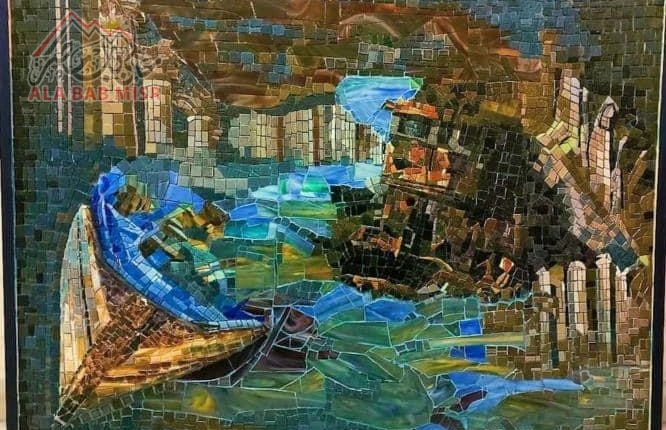 واستخدمت هنا بعض الخامات كالازملط الزجاجي والخزفي والاوبالين والتي تتناسب مع طبيعة العمل. مساحه العمل ١٢٠/٨٦ علي حائط في بحري