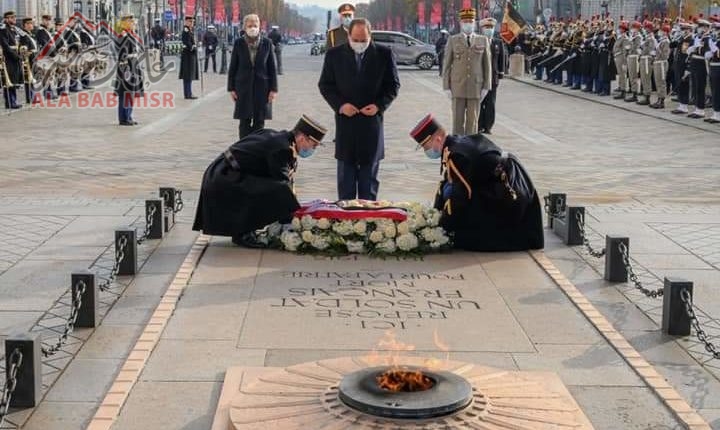في العاصمة الفرنسية باريس قام فخامة الرئيس عبد الفتاح السيسي رئيس جمهورية مصر العربية اكليل من الزهور علي قبر الجندي المجهول بميدان قوس النصر حيث اقيمت المراسم العسكرية الرسمية لسيادته وعزف السلام الوطني للبلدين.