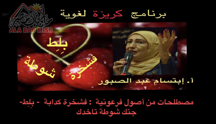 برنامج كريزة لغوية مع الأستاذة إبتسام عبد الصبور و أصول المصطلحات : فشخرة كدابة و بِلط و جتك شوطة تاخدك مكتبة الميديا بواسطة على باب مصر آخر تحديث يونيو 14, 2021 604 شارك برنامج كريزة لغوية مع الأستاذة إبتسام عبد الصبور و أصول المصطلحات : فشخرة كدابة و بِلط و جتك شوطة تاخدك 604 شارك