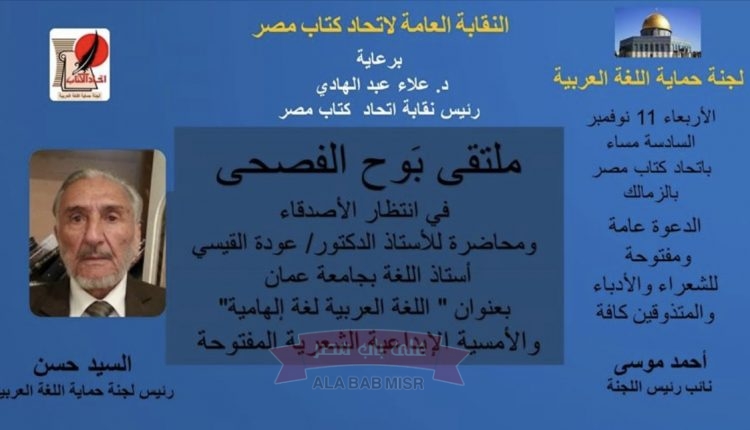 برعاية د. علاء عبد الهادي رئيس النقابة العامة لاتحاد كتاب مصر.. تعلن لجنة حماية اللغة العربية برئاسة الشاعر الإعلامي / السيد حسن.. عن استضافة العالم الأردني الأستاذ الدكتور/ عودة الله القيسي أستاذ اللغة العربية والنحو بجامعة عمان في محاضرة مرتقبة بعنوان ” اللغة العربية لغة إلهامية” ويجيب فيها سيادته على أسئلة الحاضرين ومداخلاتهم..
