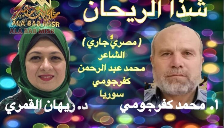 شذا الريحان – د. ريهان القمري: قصيدة ” مصريٌّ جاري ” للشاعر السوري القدير محمد عبد الرحمن كفرجومي مكتبة الميديا بواسطة على باب مصر آخر تحديث أغسطس 14, 2024 940 شارك شذا الريحان – د. ريهان القمري: قصيدة ” مصريٌّ جاري ” للشاعر السوري القدير محمد عبد الرحمن كفرجومي 940 شارك