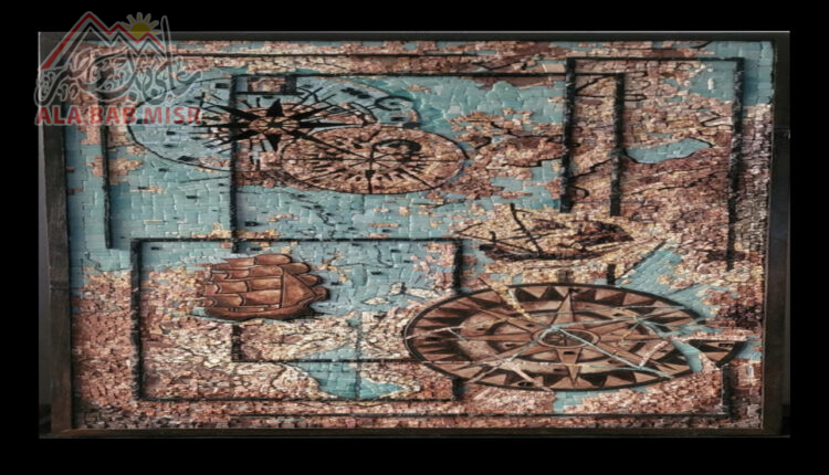 جداريه تجمع بين الخرائط الملاحيه القديمه وخرائط القراصنة والحديثة واشكال البصلة الحديثة والقديمه بإستخدام الرخام والسيراميك والازملت